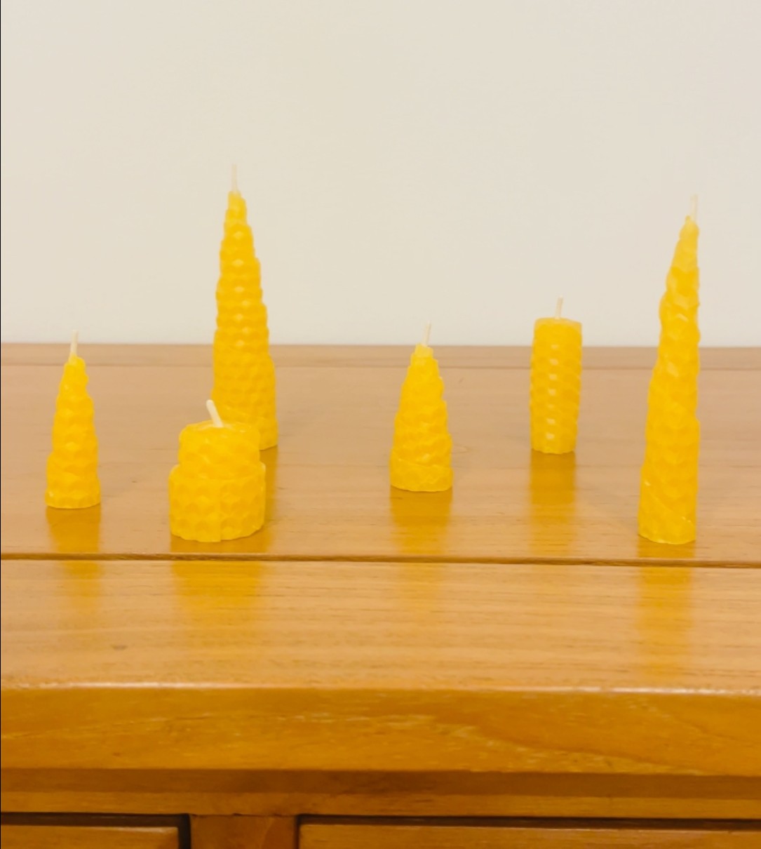 ミツバチの巣から採れる蝋から作ったシートをくるくる巻いて作ります。