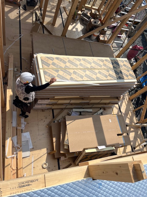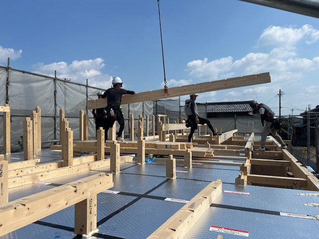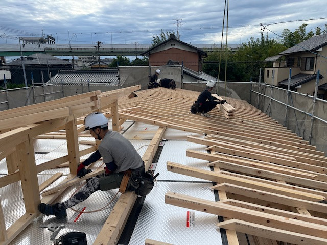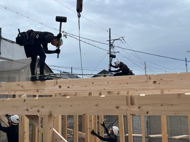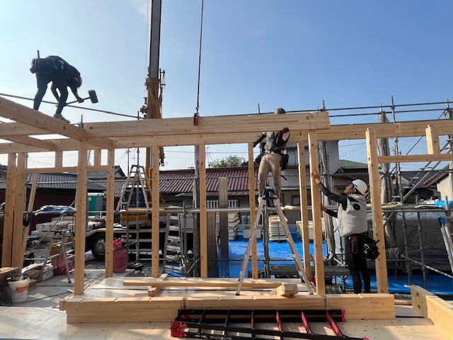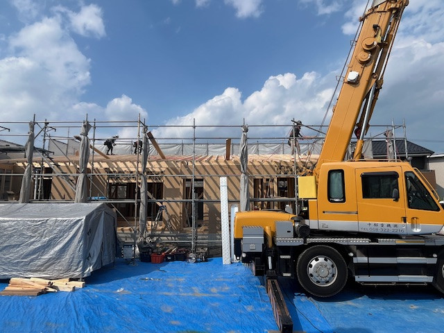 N様も見学して頂き、大工さんたちのキビキビした動きや、ドンドン組みたっていくのを目の当たりされた事で、見とれてましたと言ってもらえて嬉しかったです。暑い日でしたが、大工さん達の一生懸命やる姿は、カッコイイです!